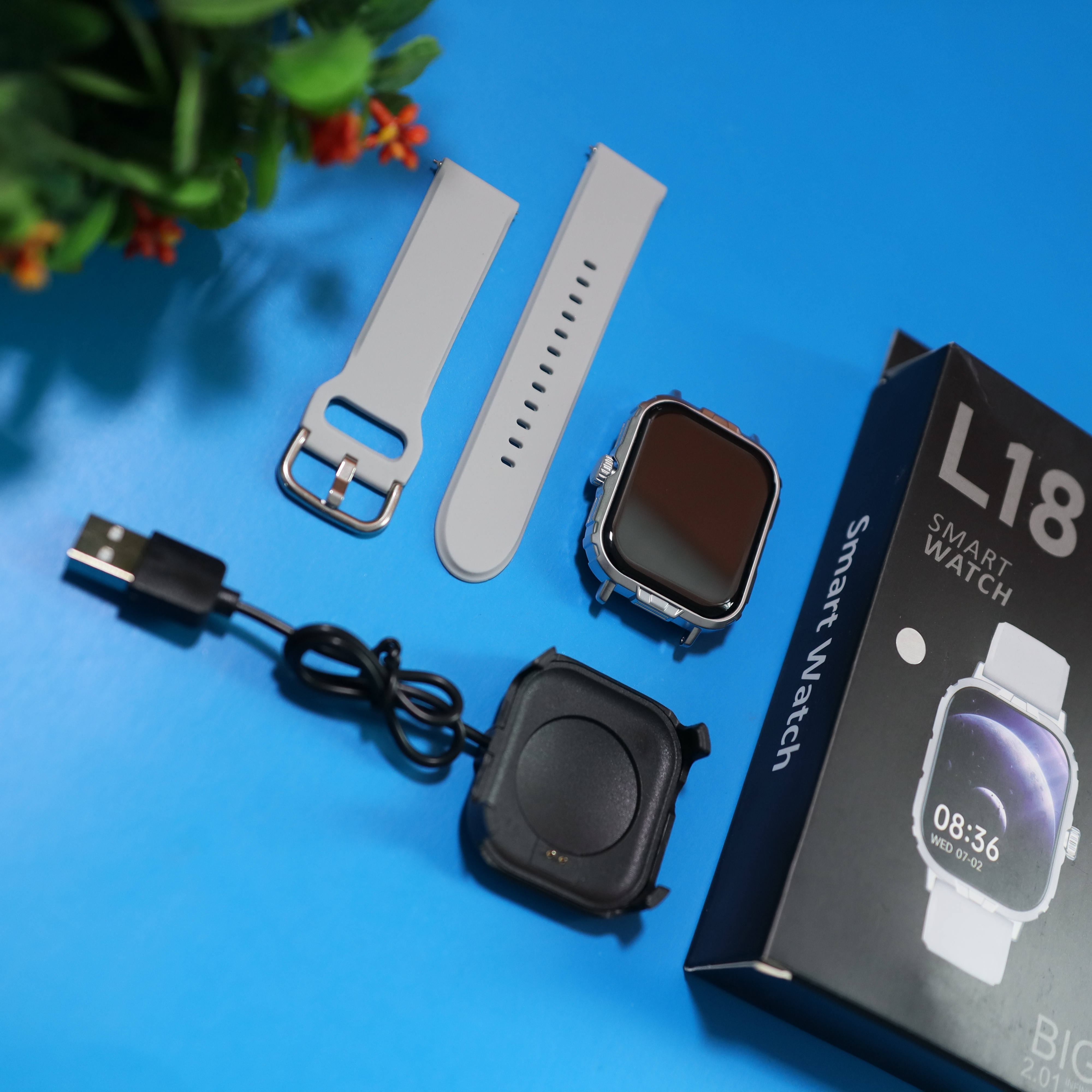 The L18 Smart Watch features a 45mm bandwidth, a built-in voice assistant, Bluetooth 5.1, and a TFT touch screen. It offers various activity-tracking functions like step, distance, calorie tracking, and sleep monitoring.,